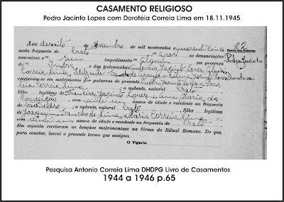 Casamento religioso de Pedro Jacinto Lopes com Dorotéia Correia Lima em 18.11.1945